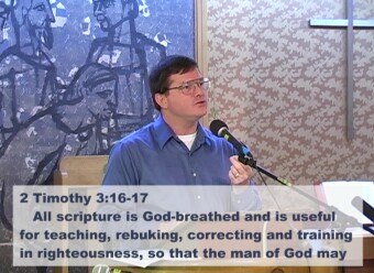 Below is a an actual frame from the edited video of Dan's first message on Matthew.  Whenever he quoted scripture, Karen widened the camera shot a little to leave room at the bottom, and later used the editing software to display the verse(s) at the bottom of the screen for reference. After OIC moved to a new facility and Dan used Powerpoint illustrations in his messages, Karen incorporated those in her video as well.